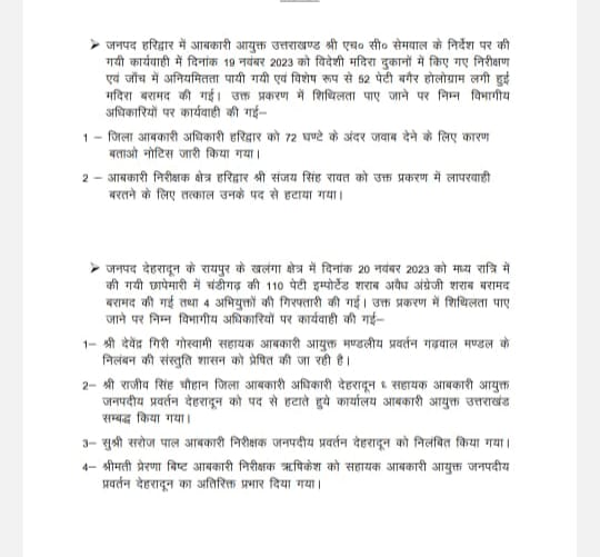 आबकारी आयुक्त हरीश चंद सेमवाल की बड़ी कार्यवाही,