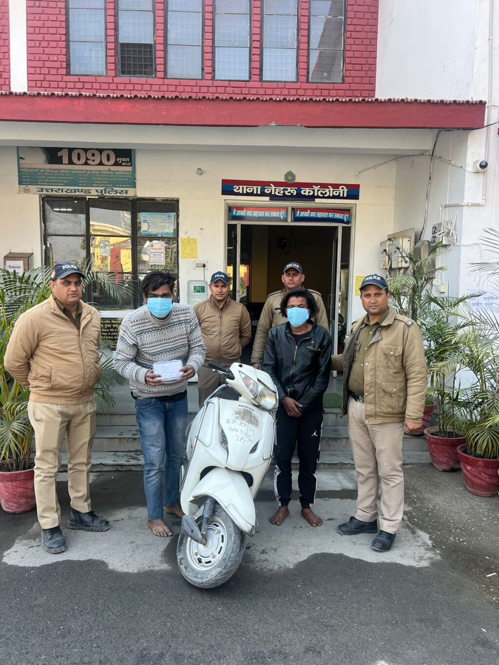 थानाध्यक्ष नेहरू कॉलोनी द्वारा घटना का शीघ्र अनावरण करने के लिए टीम का गठन किया गया ।दिनांक 30.12.23 मुखबीर खास द्वारा सूचना दी गई कि जिन लड़कों द्वारा मोबाइल लूट कीहै वह डोनो लड़के एक्टिवा में दून यूनिवर्सिटी रोड से नई बस्ती की और जा रहे हैं इस सुचना पर टीम द्वारा नई बस्ती पुल पर चेकिंग अभियान चलाया गया चेकिंग के दौरान दो लड़के स्कूटी से नई बस्ती की आ रहे थे जिन्हें पुलिस टीम द्वारा दोनों को पकड़ लिया ।नाम पता पूछने पर दोनों लडको ने अपना अपना नाम 1.रोशन थापा उर्फ रॉनी 2. विशाल चौधरी बताया ।स्कूटी के बारे में पूछने पर बताया कि स्कूटी हमारी नहीं है हमने स्कूटी नेहरू कॉलोनी से चोरी की थी अभियुक्तों की तलाश ली गई तो उनके पास एक मोबाइल फोन मिला उक्त फोन के बारे में पूछा गया तो उनके द्वारा बताया गया कि यह फोन हमने माता मंदिर रोड से एक लड़की के हाथ से छीना है अभियुक्त गणों से बरामद मोबाइल थाना नेहरू कॉलोनी पर पंजीकृत मुकदमा अपराध संख्या 492/2023 धारा 392 IPC से संबंधित है तथा बरामद स्कूटी थाना नेहरू कॉलोनी पर पंजिकृत मुकदमा संख्या 491/ 23 धारा 379 IPC से संबंध है जिसका आधार पर उपरोक्त मुकादमों में धारा 411/34 की बढोतरी कर अभियुक्तों को गिरफ़्तार किया गया माननीय न्यायालय द्वारा अभि० को न्यायिक अभीरक्षा भेजा गया