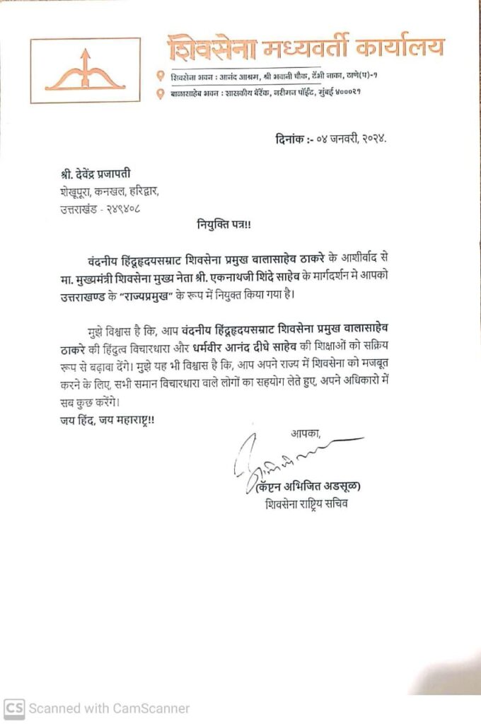 वंदनीय हिंदूहृदयसम्राट शिवसेना प्रमुख बालासाहेव ठाकरे के आशीर्वाद से मा. मुख्यमंत्री शिवसेना मुख्य नेता श्री. एकनाथजी शिंदे साहेब के मार्गदर्शन मे आपको उत्तराखण्ड के “राज्यप्रमुख” के रूप में नियुक्त किया गया है।