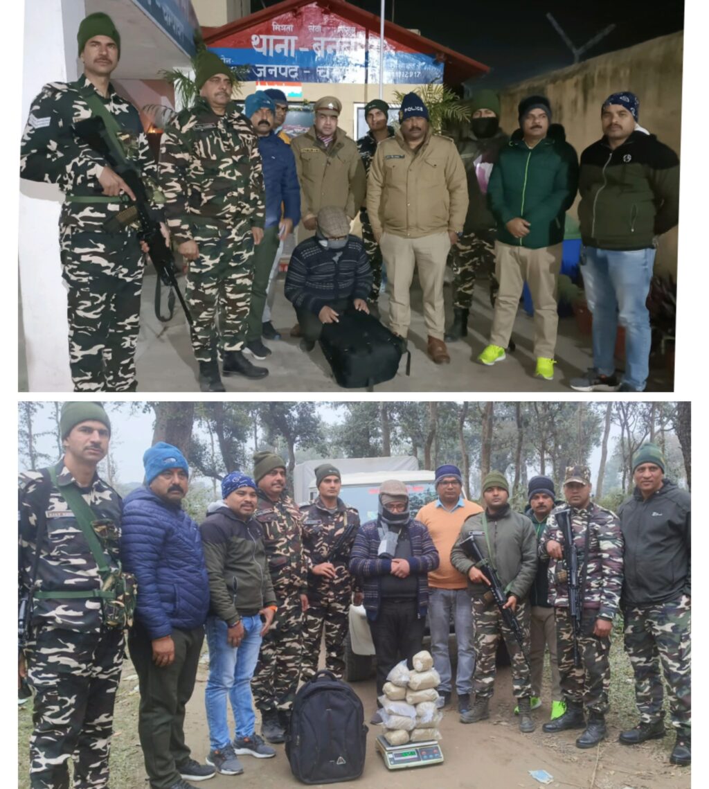 मा0 मुख्यमन्त्री उत्तराखण्ड सरकार द्वारा वर्ष 2025 तक उत्तराखण्ड प्रदेश को ड्रग फ्री देवभूमि बनाये जाने हेतु दिये गये निर्देशों के क्रम में जनपद चम्पावत में श्री अजय गणपति कुम्भार, पुलिस अधीक्षक महोदय चम्पावत के निर्देशानुसार तथा क्षेत्राधिकारी महोदय चम्पावत के पर्यवेक्षण में जनपद चम्पावत में मादक पदार्थों की तस्करी की रोकथाम किये जाने हेतु सभी थाना/एसओजी प्रभारियों को अभियान चलाकर नशा तस्करों के विरुद्ध कार्यवाही किए जाने हेतु निर्देशित किया गया है। उक्त के क्रम में दिनांक 22.01.2024 को *थाना बनबसा* क्षेत्रान्तर्गत लगने वाली *भारत नेपाल अंतर्राष्ट्रीय सीमा* पर स्थित पिलर न0 802/2 क्षेत्र से *थाना बनबसा पुलिस, एसओजी व एसएसबी टीम* द्वारा *अभियुक्त वीर बहादुर बोरा पुत्र धर्म बहादुर बोरा,* उम्र 50 वर्ष, निवासी ग्राम मल्ला डी, वार्ड नंबर 8, थाना पूर चौकी, *जिला बैतडी, नेपाल राष्ट्र, हाल निवासी* हाउस नंबर 373 ए, फर्स्ट फ्लोर, सुभाष मार्केट, कोटला, मुबारकपुर, *लोधी रोड, मध्य दिल्ली* को *09.555 किलोग्राम गांजा* परिवहन करते हुए गिरफ्तार किया गया। अभियुक्त उपरोक्त के विरूद्ध थाना बनबसा में मु0अ0सं0- 14/24 अन्तर्गत धारा 8/20 एनडीपीएस एक्ट पंजीकृत किया गया है।