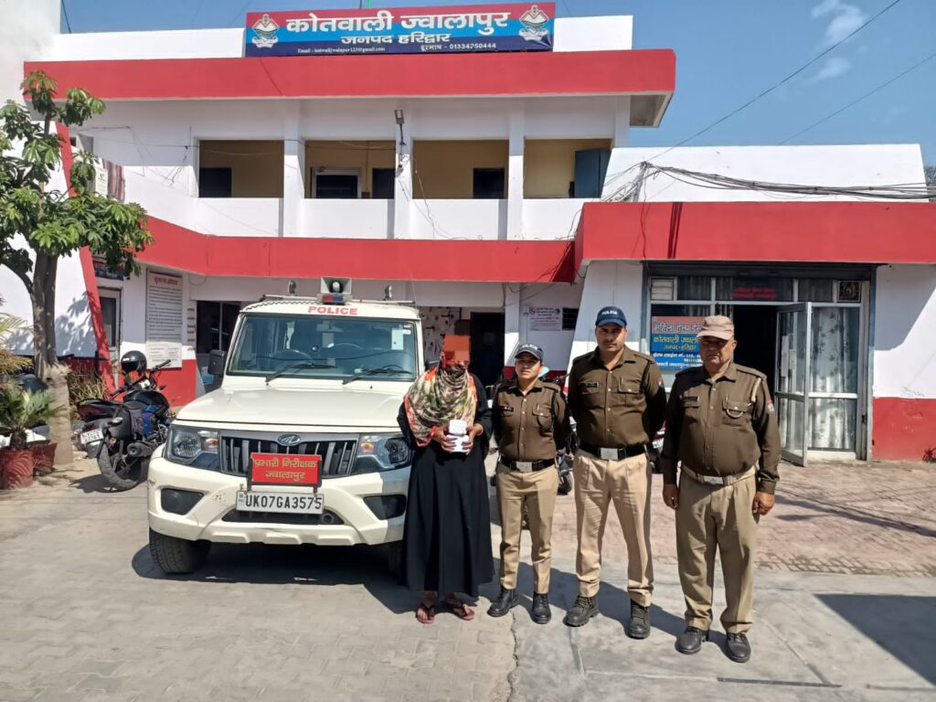 माननीय मुख्यमंत्री उत्तराखंड महोदय के ड्रग्स फ्री देवभूमि अभियान 2025 के तहत जनपद को नशा मुक्त करने व नशा तस्करों के विरुद्ध वरिष्ठ पुलिस अधीक्षक जनपद हरिद्वार द्वारा चलाये जा रहे अभियान को सफल बनाने के क्रम में ज्वालापुर पुलिस द्वारा महिला अभियुक्ता को मौ0 अहवावनगर से 106 ग्राम चरस व ₹5100 नगदी के साथ दबोचा गया।