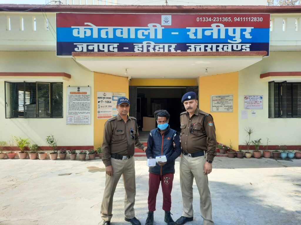 जिसके अन्तर्गत आज दिनांक 19.03.2024 को रानीपुर पुलिस टीम को मुखबिर खास ने सूचना दी कि मकीनो कम्पनी के पीछे लिपटिस के बाग में एक व्यक्ति बडी मात्रा में स्मैक लेकर आ रहा है, इस पर पुलिस टीम द्वारा तत्काल कार्यवाही करते हुये मकीनो कम्पनी के पीछे लिपटिस के बाग से अभियुक्त दानिश पुत्र इसरार नि0 ग्राम जमालपुर खुर्द थाना रानीपुर हरिद्वार को गिरफ्तार कर उसके कब्जे से 05.20 ग्राम अवैध स्मैक की बरामदगी की गयी, अभियुक्त दानिश के विरूद्ध थाने पर मु0अ0सं0 99/24 धारा 8/21 एनडीपीएस एक्ट का अभियोग पंजीकृत किया गया । गिरफ्तार अभियुक्त को मा0 न्यायालय में पेश किया जा रहा है ।