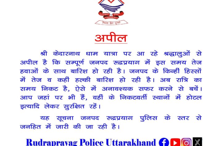 अपील श्री केदारनाथ धाम यात्रा पर आ रहे श्रद्धालुओं से अपील है कि सम्पूर्ण...