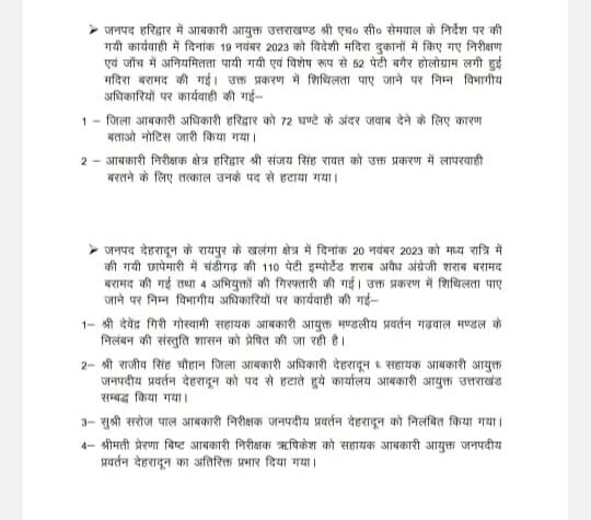 देहरादून आबकारी आयुक्त हरीश चंद सेमवाल की बड़ी कार्यवाही, अपने कार्यों में लापरवाही बरतने...