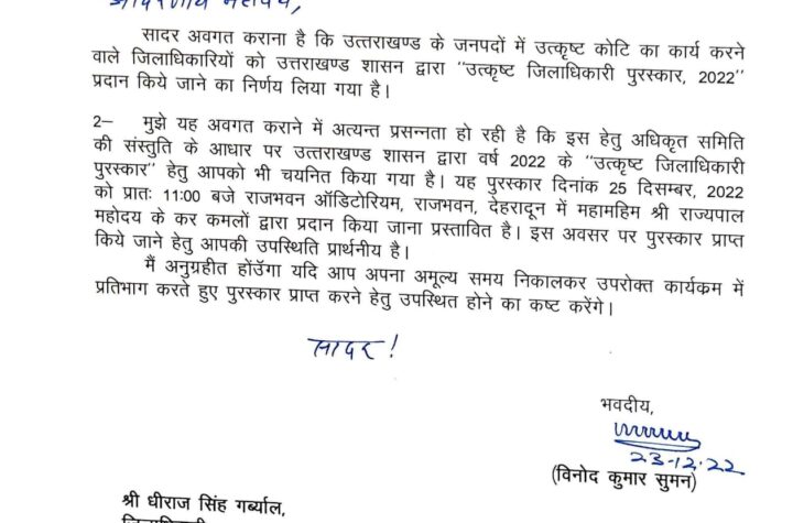 उत्कृष्ट जिलाधिकारी पुरस्कार 2022 से सम्मानित होंगे 5 आईएएस अफसर। जिलाधिकारी नैनीताल धीराज गर्ब्याल...