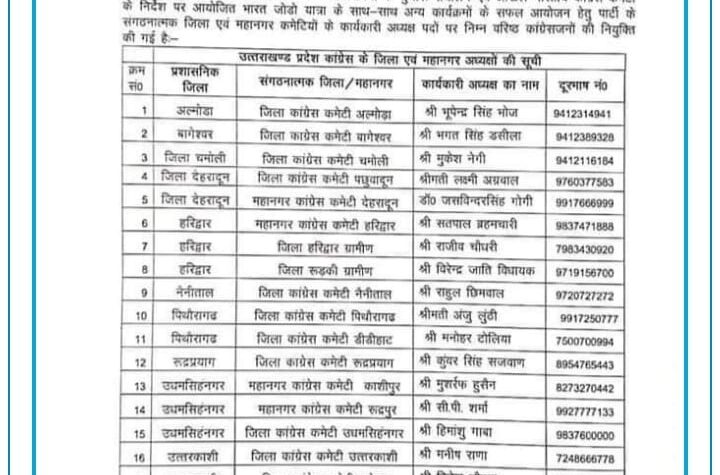 देहरादून। उत्तराखंड कांग्रेस कमेटी द्वारा संगठन को मजबूत करने के लिए जिला स्तरो पर...