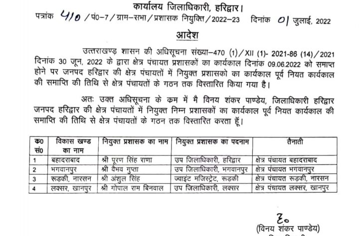 हरिद्वार के जिलाधिकारी विनय शंकर पांडेय की ओर से क्षेत्र पंचायतों में संबंधित एसडीएम...